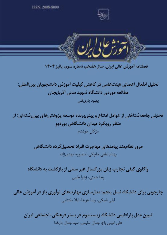 نمایه شده: بله. تمامی مقالات چاپ شده در مجله آموزش عالی ایران در پایگاه علمی Google Scholar، پایگاه بین المللی تخصصی ACADEMIA، صفحه علمی لینکدین Linkedln، پایگاه استنادی جهان اسلام ISC، مگیران، نورمگز، پرتال جامع علوم انسانی (ensani.ir)، سامانه مرکز اطلاعات علمی ایران (SID) و پایگاه علمی سیویلیکا نمایه می گردند و دارای کد و شناسه می باشند. آدرس صفحه مجله آموزش عالی ایران در سمت راست صفحه بر روی لوگوی سایت ها و پایگاه های نمایه شده و همچنین در بخش بانک ها و نمایه نامه ها در اطلاعات نشریه پیوند داده شده است.